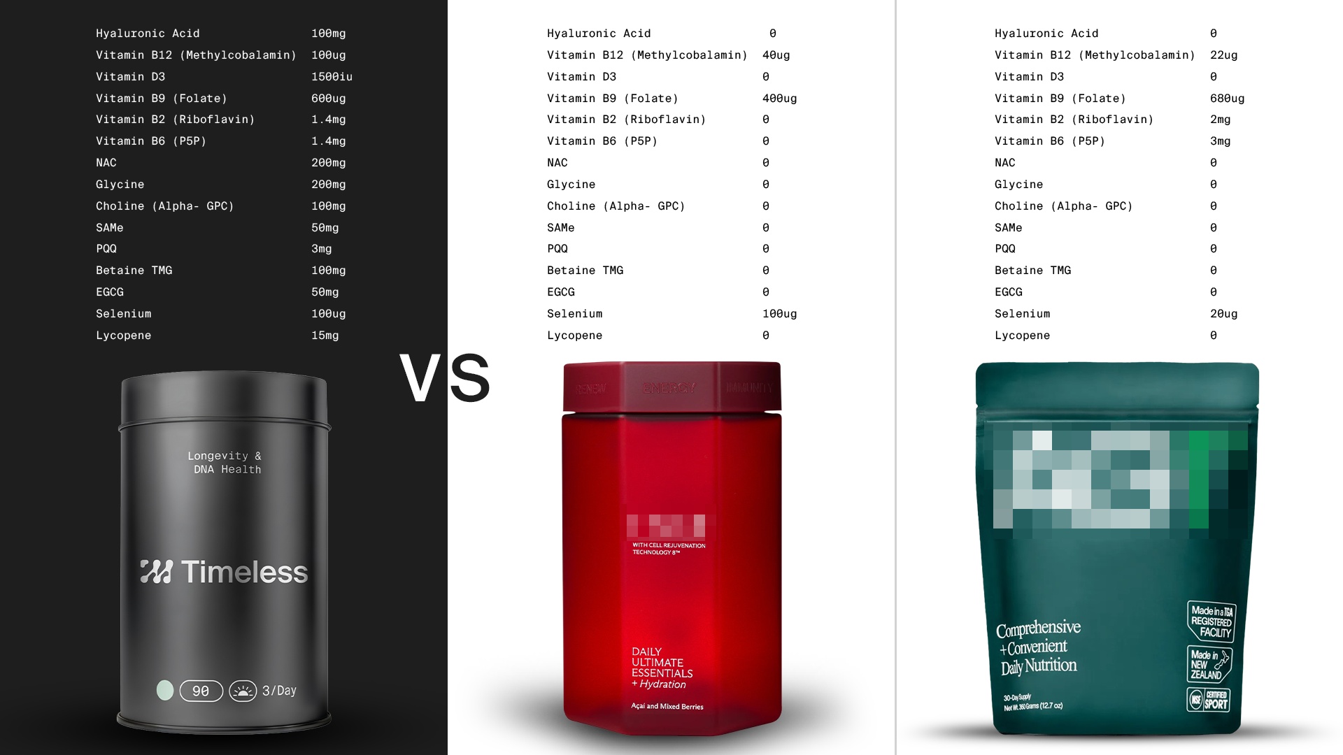 Ne visi priešsenėjimo papildai yra vienodi. Kol kiti siūlo neindividualizuotus mišinius su nepakankamai dozuotais ingredientais, Timeless suteikia kliniškai pagrįstą, moksliškai pažangią formulę, sukurtą kovoti su senėjimu jo šaltinyje.